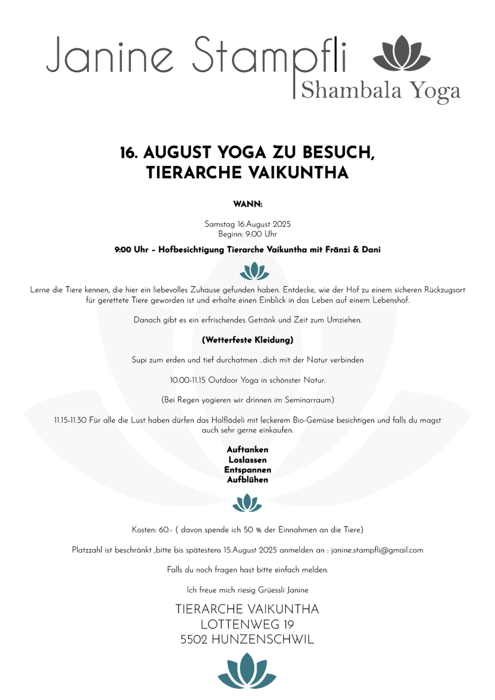 Suche dir einen schönen Platz auf der Wiese, rolle deine Matte inmitten der Alpakas aus und nehme Kontakt zu den Tieren auf. Erlaube dir dem Fluß der Yoga-Bewegungen zu folgen, während die neugierigen Alpakas sich frei zwischen der Gruppe bewegen.Spüre die beruhigende Wirkung der Alpakas auf deinen Geist und die Seele und erlebe 90 Yoga-Minuten mit teils fließenden, ruhigen aber einigen wenigen intensiven Elementen. Unsere erfahrenen Yoga-Lehrer*innen bieten dir einen Mix der sich für alle wunderbar eignet, auch Yoga-Einsteiger.